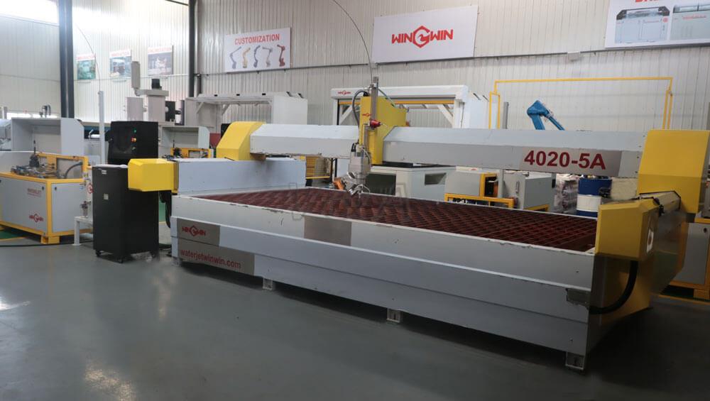 WINWIN company supports color customization, this equipment is WW40jet intensifier pump + 4020 AC 5 cutting table, full stainless steel protective structure, good protection, no rust, oil immersed structure, long service life of ball screw and linear guide, fully aluminum alloy cutting head, light weight, reduce the load of the cutting table, AC 5 axis head, cutting angle can reach ±68°, C axis can be 360° rotation.